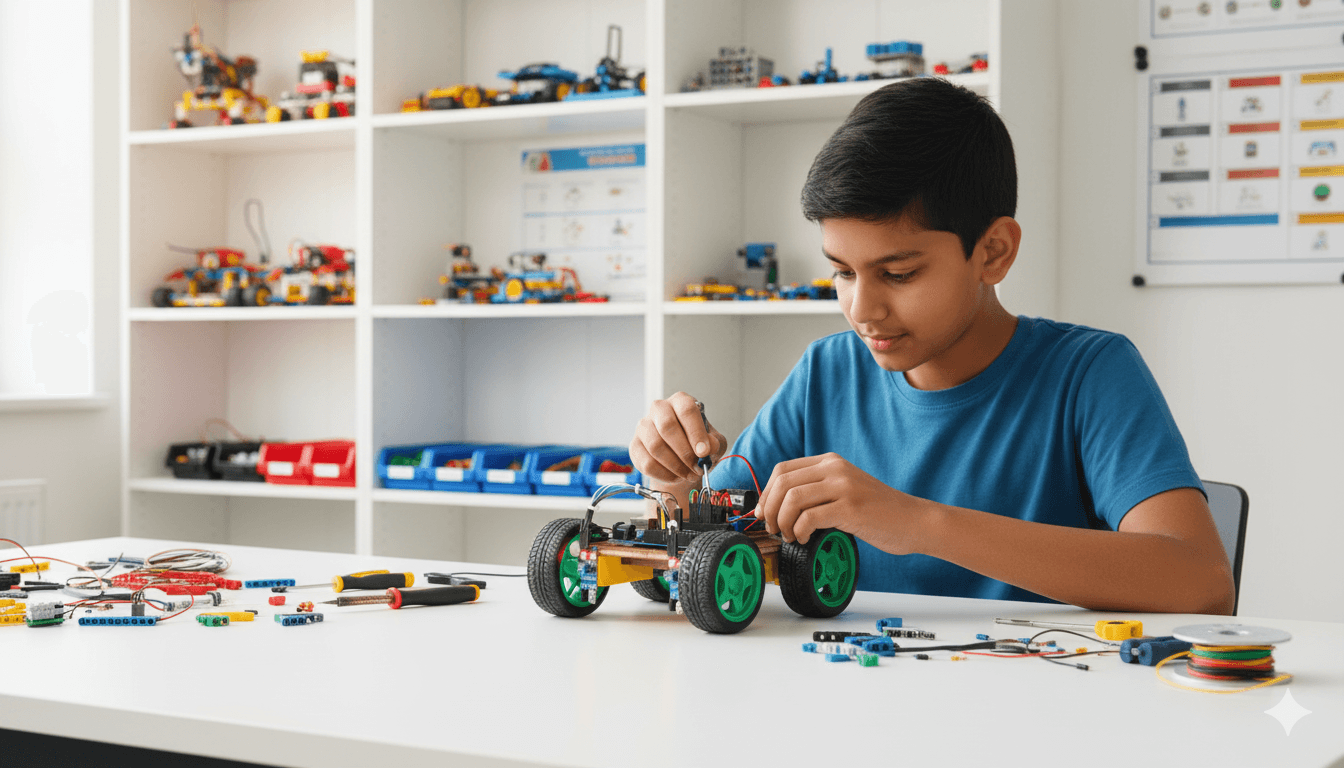 Your imagination shapes the future. This program gives you the tools to build it. This 4 in 1 masterclass transforms curious learners into future-ready innovators. With 42 sessions, 84 hours, and 60+ hands-on projects, students master robotics, coding, design, and AI-powered problem-solving